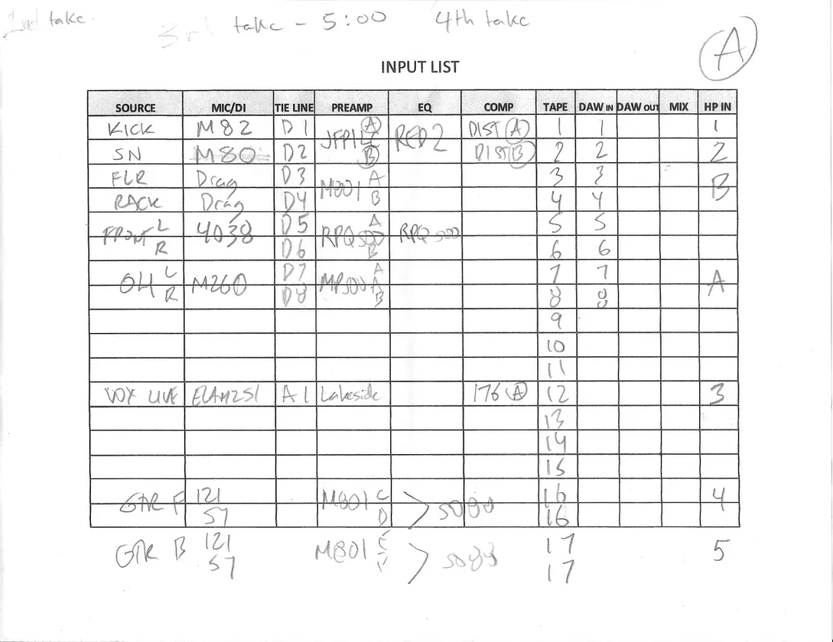 The entry reads like a quick snapshot of the session, touching on the Larry and the band’s approach in the room. There are several fun nuggets as well, from scans of the paper input list to the source of the 2-inch tape they used [24-track tape (+6, 15 ips, no NR, IEC EQ)], plus an inspired moment shared between the producer/engineer and a musician. The post leaves you with a simple truth: Take notes and stay on track!