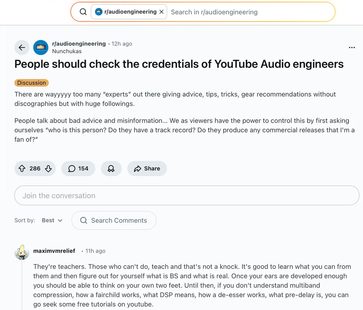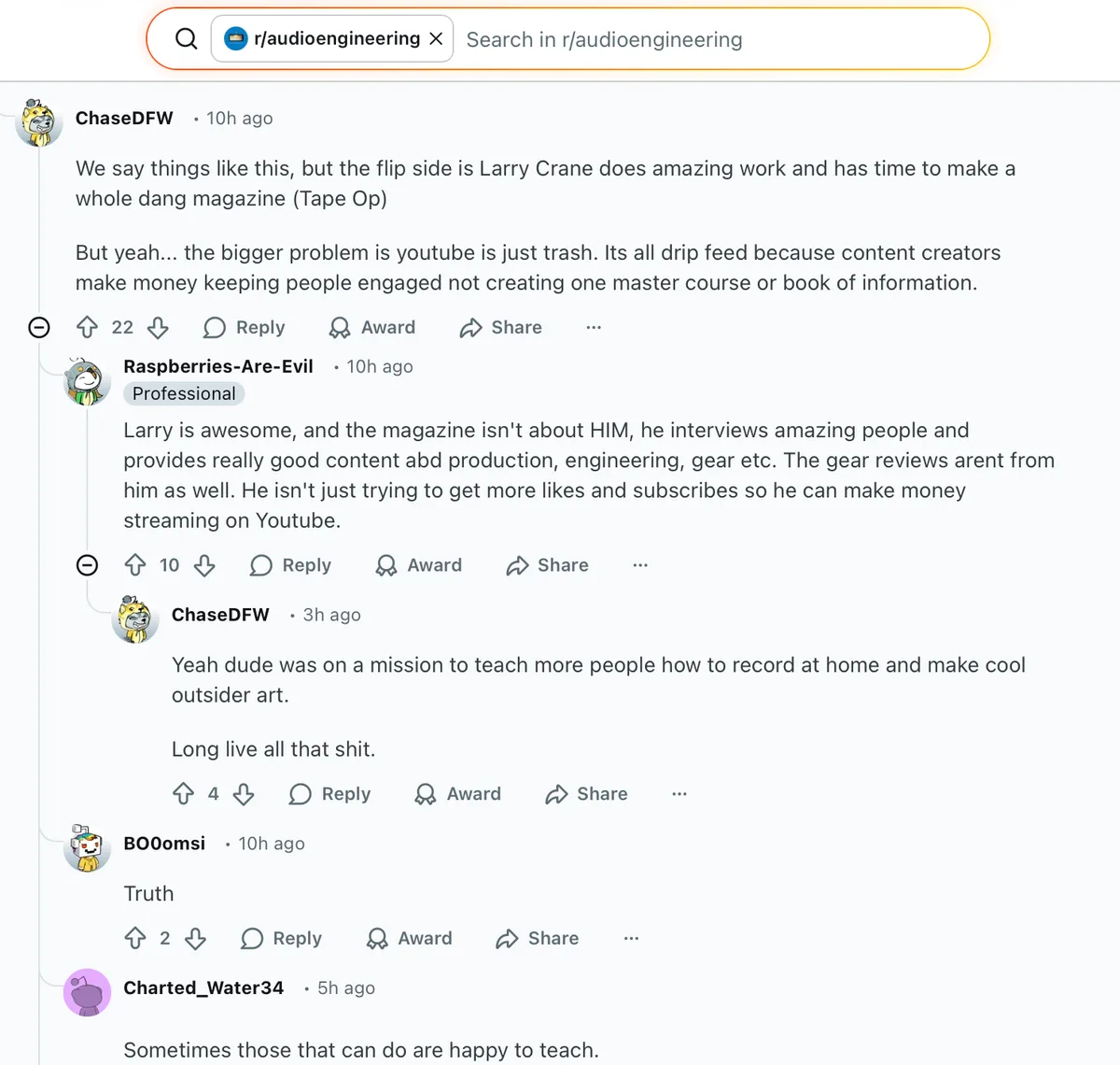 Visit this recent Reddit thread to follow an interesting conversation about YouTube recording influencers and Tape Op shout out. OMG. Larry has written a LOT of gear reviews over the years, by the way. Visit us on YouTube for plenty of actual information and good times.