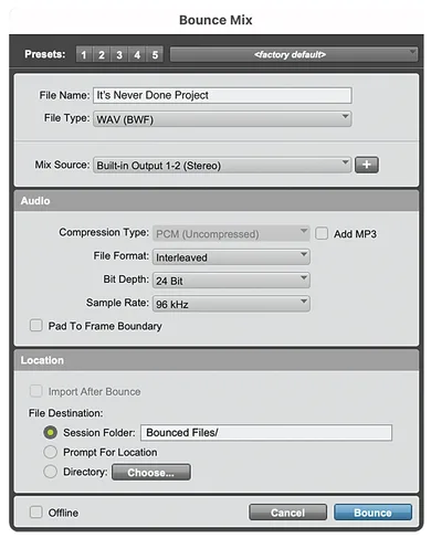 Sometimes my close-listening, hyper-focusing brain latches onto an "issue" that might actually be one of the elements making the mix interesting and special. It's a big time-suck trying to kill what isn't broken, and often it can make the mix worse! So, if I can check out the track(s) while distracted with something else – laundry, a jog around my neighborhood – and nothing jumps out to me as a problem, it's a good sign that it's time to stop twiddling knobs.