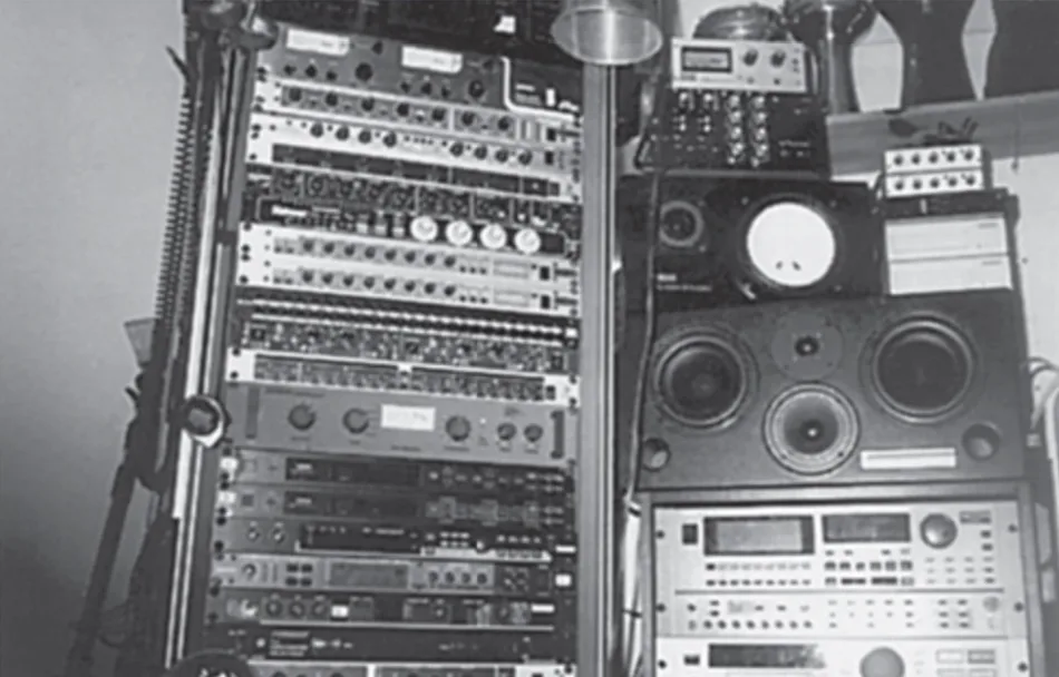 I never really wanted to have a home studio, because I felt that I had been "spoiled" by working with all of the great gear at places like Baby Monster. I always wrote and demoed songs on four-track cassette, and loved the sound of it. In fact, I still think some of the four track demos have better guitar sounds in places than some of the BOS records we released. Maybe it has something to do with the in-line impedance transformers I used, and the input stages of the Tascam or Fostex. I loved to pack the level on. Meters be damned! It had long occurred to me that it would be wonderful to do stuff in my apartment that was spontaneous but a bit higher fidelity than the 4-track cassette stuff. In 1995, I started getting more interested in getting a home studio together. I bought two Akai DR4d's (stand alone hard drive machine) because I had heard such horror stories about ADAT transports. The first things that were done at the studio, that were released, were the last BOS tracks we ever recorded, two cuts for two Wire tribute CDs. Part of what made the studio possible was that I was given some fine equipment from my brother-in-law, who had decided to dismantle his own home multimedia studio. So I ended up with wonderful stuff I never could have afforded: a Bryston 4B power amp, two Westlake BBSM-6 monitors, a Lexicon PCM-70.... It snowballed from there, and I realized that my pathological equipment lust had a purpose. I could learn a lot by actually owning the gear because I would have time to experiment and really learn the engineering stuff that I had never had a chance to learn while we were paying by the hour.