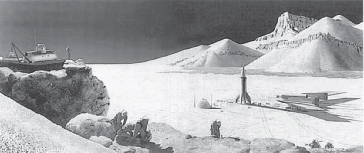 The choice of Chesley Bonestell is actually very specific. When I was a kid, there was a children's book called From The Earth To The Moon, which was illustrated Chesley Bonestell. It was actually illustrated using a number of paintings he had done for Collier's magazine in the 40's and 50's about what space travel would be like. The illustrations were done during a period when there hadn't even been any exploration of the upper atmosphere. It was an entirely theoretical proposition, space travel. And the thing that amazed me over time was how many insights Chesley Bonestell had just from a purely academic knowledge and from an Earth-based knowledge of what the other planets were like and what space travel would be like. It was amazing how often he was right about how things would go. And about how things would look. It's not amazing that he got some of the things wrong that he got wrong. But that blend of just this uncanny prescient quality of being able to discern how things would go, long before anyone had even postulated the ideas, paired with just a naive perception of what technology would be around, and an unavoidably naive perception of what technology would really be here, I think gives his paintings a real charm, and I don't know of anyone who's working in an equally futuristic vein at the moment. There are a lot of buzz words and catch phrases that get kicked around in popular culture and fine art, you know, the information age and technology and all that kind of nonsense. But here's a guy who imagined that space travel was possible, found out everything he could about the methodology that would probably be employed and did these incredible, meticulous illustrations of what it would be like. And he was right far more often than he was wrong. He's a really remarkable character.