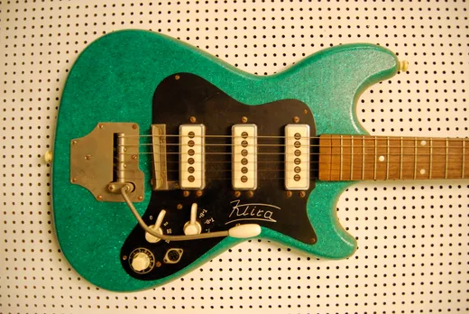 A few! I have the Nu-Sonic, I have the Bison Bass and a Bison Guitar. I like the Burns very much — the sound is so extreme. It's different than any other brand of guitar. I also have Hofner guitars, and this Klira I bought at Jebrimont for 1,500 pesetas (about $15). Klira is great! I've bought another I like to use. The pickups of those guitars produce an amazing sound. Sometimes it's good to go extreme, you don't want your production to sound like everybody else. For instance, the [Fender] Strat is a very good guitar, but Burns goes farther. When you want to play with the treble of the amp, there's nothing like Burns.