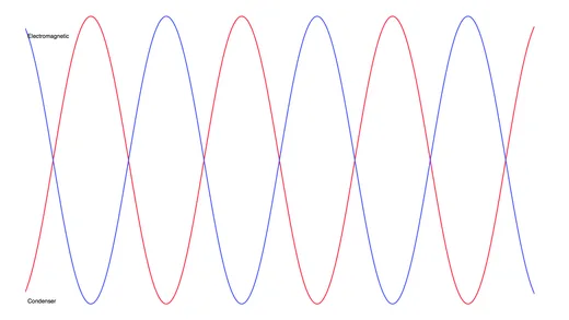 Following what's been said above, let's plot the output of a condenser microphone and the output of an electromagnetic microphone as the same sound pressure varies on their diaphragms: we'll obtain two resulting waveforms which are 90° out of phase.