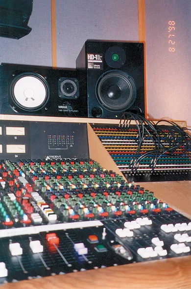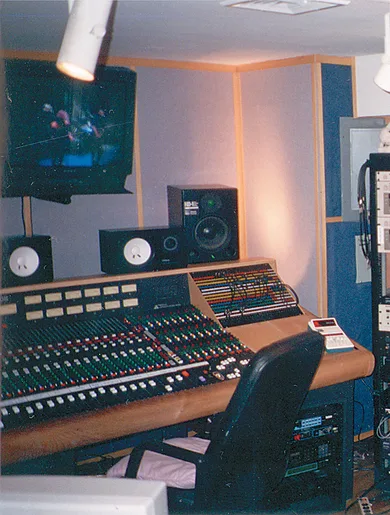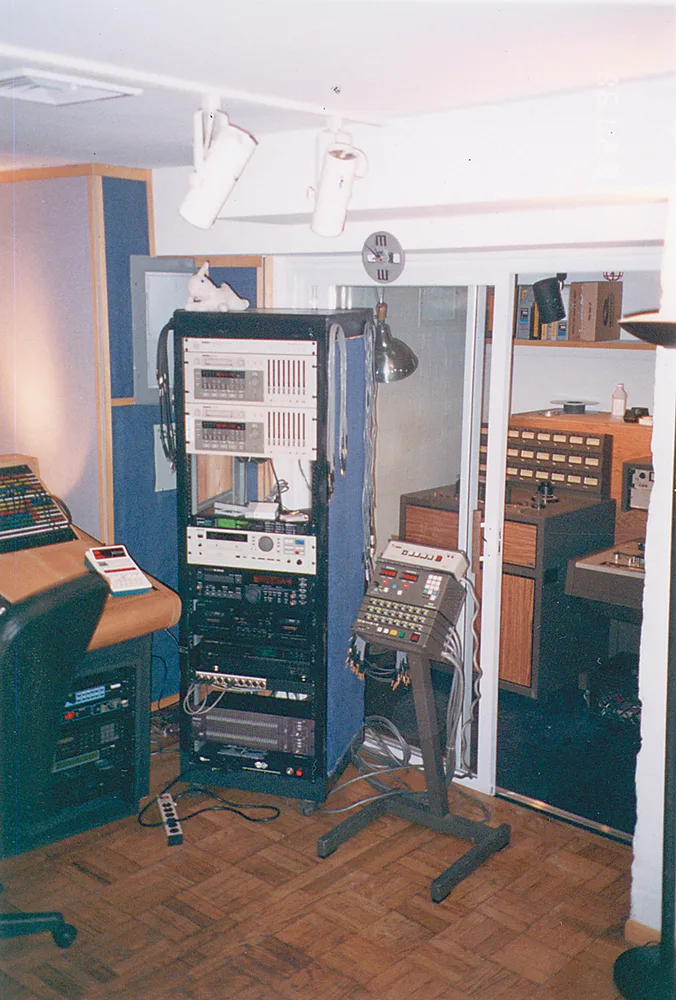 The studio isn't physically big enough to hold too much more. The most fun is the board, the console — the monitors, HD 1's, Meyer Sound. The studio is just the control room, with a little overdub booth. The tape- machine room can be used as an overdub room. All the spaces we record in.