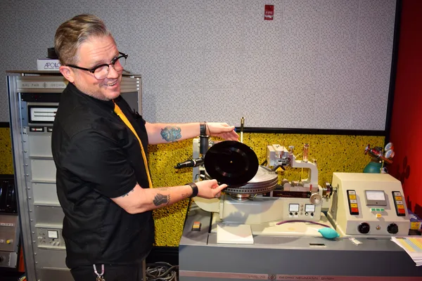 DB: No matter what, if we're doing it live, if someone's bringing in a digital file, a tape, a CD, whatever, once it's all mastered and all the levels are right, it gets cut on the lathe. You cut an acetate or a lacquer – the lacquer is a coated aluminum disc – and you do one lacquer for each side of the record. You send that off to an electro-plating place; you get this nickel and silver–coated disc, you peel off the nickel and silver, and you get a reverse of the lacquer. Those go in the stamper in the presses, and they transfer the grooves to make a vinyl record with the grooves that match the lacquer. Most places don't record directly to lacquer; we eliminate several steps with that. One time we did the world's fastest record, where Jack White did a live-to-lacquer session down in Nashville, and Ben Blackwell – who's one of Third Man's co-founders – took the lacquers and raced them across town to United Record Pressing. United made the stampers, put them on a press, and pressed up records. He drove back with records in under an hour. We call that the world's fastest record. People who were at the show got to go home with a record of the show. If you go online at Third Man Records, you can find the whole story of the world's fastest record.