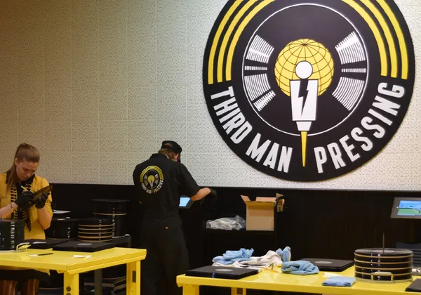 DB: Opening weekend we pressed the first two White Stripes records [The White Stripes, De Stijl], a deluxe version of the first Stooges record [The Stooges], and a reissue of the first MC5 record [Kick Out the Jams]. Those were all on Third Man Records; we licensed those last two, and of course we have The White Stripes. Our friends from ESP [Essential Screen Printing] set up in the back, and they were live silk-screening the covers for those. On another machine we had a gospel reissue project. We don't just do Third Man records here. We also had two 7-inch [presses] running, which was for Derrick May and Carl Craig. Those are two of the pioneers of the Detroit techno scene. Typically, their records are pressed on 12-inch [vinyl], so it was an exclusive thing.