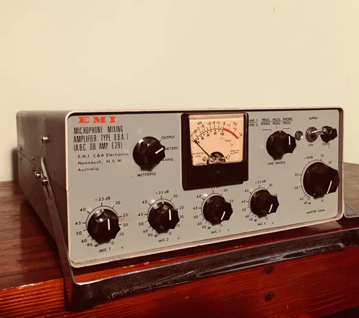 Liam's EMI preamps have some back story: "It's an interesting one. It's a portable 4-channel microphone mixer from the late '60s / early '70s called an EMI OBA-1. It was made in Homebush here in Sydney – actually, I know the building it was made in, as I drive past it all the time. It was a four mic input unit that summed to a mono output, made for outside broadcast tasks for the ABC [Australian Broadcasting Corporation]. When I got it, it was all original and in very good condition. I used it for a short while as a mono preamp (or sometimes actually did some blending of several mics to it's mono output). The issue is that it lacked headroom on loud sources – like electric guitar – as it had no input pad. It crunched real bad in a nasty way. I used it a bit on vocals and acoustic guitar, though I also wasn't completely mad about the signal-to-noise on the output, and, truth be told, it had a bit of an odd tone. But hey, it looked cool! I decided to get it looked at by Rob Squire in Adelaide, a wonderful technician who runs Pro Harmonic https://www.proharmonic.com. He modified it for direct outs for all four channels, whilst adding switches for pad, phase reversal, and 48v phantom on all channels. By bypassing the original summing transformer and coming out of Rob's output cards, all my issues had gone away. The unit changed from being a curio into the most-used and dependable piece of gear in my collection. It's clean, big sounding and works on everything. On RBCF, I used it for all electric guitars as well as drums at the Melbourne sessions where we cut 'Bellerine'."