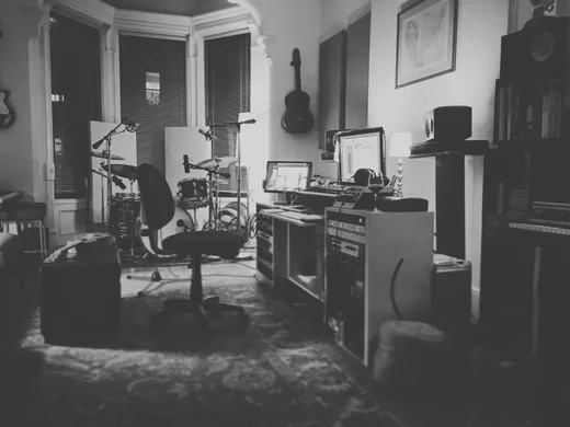 I was dancing, and who knows, maybe the dancing did something. [laughs] But in terms of what happens on those tracks where I play everything, and I also record it, even the introduction of an engineer can change it, because I'm so fast at grabbing a punch-in, or rolling back to exactly where I need to be. That communication, of having to talk to someone else, can trip me up. My house is generally set up so that there's a general version of "set up" that's ready to go at all times. Right now, there are two ribbon mics that are ready to be the room mics at any point, and there's this Bock 251 that is my go-to workhorse mic. The drums are mic'd up and those mics can move around the room to grab guitar amps, vibraphone, or percussion. Everything is ready to record. There is almost never set up time; maybe a half hour.