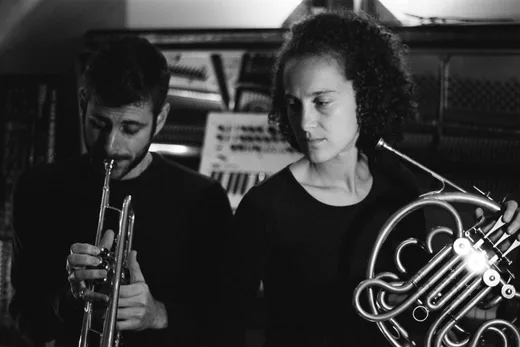 AH: Synths just sound so cool! It's so awesome for brass instruments to play over. In the classical music world, you play over acoustic piano. For example, as a music student, Aaron would stand up and play a trumpet sonata with a piano. But a piano doesn't actually blend that well with a trumpet. They don't sound the same. The piano has a percussive sound. It dies after you hit it. With synthesizers, we can change the feel of the sound, all of the different controls and envelopes, so that it can support a brass instrument really well. That's been really awesome. We've also been experimenting with a lot of pedals and stuff. I've been using an Elektron Model: Samples.