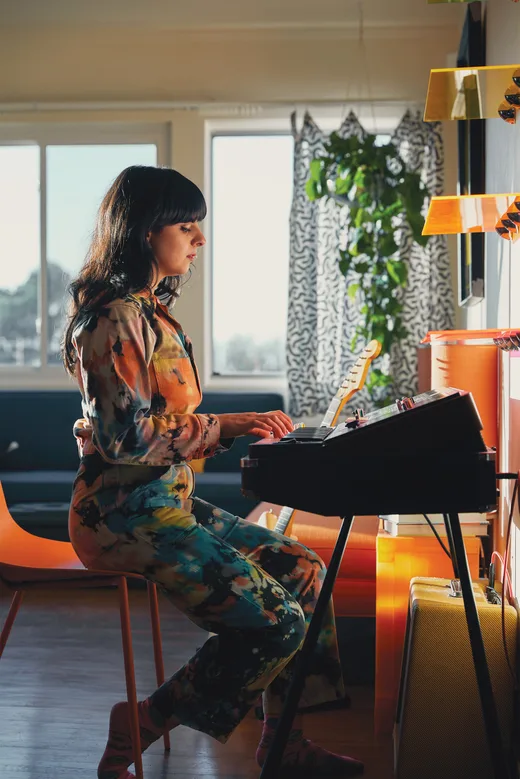 Sadie came to the Bay Area to work on three songs with me for her record Haunted Painting. We worked at Tiny Telephone in Oakland and in San Francisco. It was just her and her drummer, Zoë Brecher. Like myself, Sadie plays most of the instruments on her records except for drums; though she is ten times more talented at every instrument than I am! Sadie loves to explore. We had 15 or 20 pedals that we played with, and definitely plugged in every synth and mic'd every instrument. It felt like working with someone who you already knew, somebody who you're familiar with, and you understand what they're trying to do and what they're wanting out of their music. It was easy to suggest instruments, like the Moog Source or the Prophet VS; knowing that these are definitely instruments that this person's going to use. At that time, Tiny Telephone in San Francisco had a harpsichord, but some of the strings were broken. I didn't realize that Sadie wanted to record it before she came to the studio; but it was on the gear list, so she had prepared a part for harpsichord that she wanted to play. There wasn't an easy way to tune it without breaking a string; in fact, a few of the notes that she needed were already broken. So, I said, "Sorry, Sadie; I guess we can't record this harpsichord. But what if we record it on a piano, and I'll mess around with it a little bit and see what happens?" I remembered that we have this box of tools for piano treatment, like ping-pong balls, metal chains, and paperclips. So, we placed them over the strings of the piano, and, in a weird way, it sounded kind of like a harpsichord because the bouncing ping-pong balls and chains brought out the bright metal sounds of the strings. It turned a bummer studio moment into a unique recording. That was a pretty strong memory of us working together.