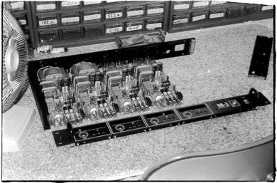 "The first major project of any kind that I had done, I think, would have to be a couple of consoles that I built for dB Sound, based here in Chicago, back in 1977. Those consoles were specifically done for the group Kansas. For some period of time, dB had been working with the group Kansas, before Kansas was a real big band. The way I understand it, when it came time for that fall of 1977 tour, Kansas said to DB Sound, we're a bigger group now, we're getting bigger exposure. You've got to upgrade your equipment. I had done some smaller projects for dB at different times, and they came to me and said, 'We'd like to do a console, and we'd like you to do it.' In the fall of 1977, miraculously, two consoles got built, a front-of-house and then a stage mix console. The main modules for those, I built as modular as I could. There was a particular module common to both consoles that had the line input section, the mic preamp section, and an equalizer, all in one module. I called it the IM-200 module, just the Input Module, IM-200. Rationality at work there — simpler to remember what they are. Some of those modules have been made available as sort of vintage Hardy equipment or something. Oh, jeez, the nightmares I could tell you about that whole project, but at any rate they're still around. In fact, I've got a box of about 8 or 10 of them under that table over there that one of the guys who is still involved with dB sound, Harry Witz, wants me to fix. So I still will fix them; I'll offer repair services for people that have those. Even though they're 22 years old at this point, I'm happy to keep them running as much as I can. That was my first real, substantial product or project but that was fall of '77." At that point, Hardy still used monolithic op-amps.