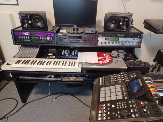We had a Technics 1200 turntable and a cheaper Numark mixer that I still have. It's all faded out on top. It had two short faders, a crossfader, and a cue system. No EQ, and Numarks didn't have VU meters, just two lights for left and right. If it hit 0 dB it would pop on, and that was about it. My friend, Don Newkirk, who passed away last year, his brother had bought an 808 in the early '80s. I saw this thing in junior high school, and thought, "What kind of beatbox is that?" I learned how to program it, and then someone down the street had an Oberheim DX. By the end of high school, I bought a Sequential Circuits TOM drum machine, which I still have. I programmed the title track for Stetsasonic On Fire with the 808 and tripled up hi hats doing that "tszz tszz tszzz" thing before drum and bass music came along. Before I got to the studio, the first sampler I used was the Casio SK-1, which taught me so much about speeding up and slowing sounds down. When we got to Calliope it was the AKAI S900 and the E-mu SP-12. During that time for home projects, I used a Digitech guitar pedal that sampled and looped up to 8 seconds, and that was everything. I figured out how to take the Sequential TOM's trigger button and use it to trigger the sampler. Oh, man; that was the next phase! The guitar pedal wasn't designed to sample records, but necessity is the mother of invention.