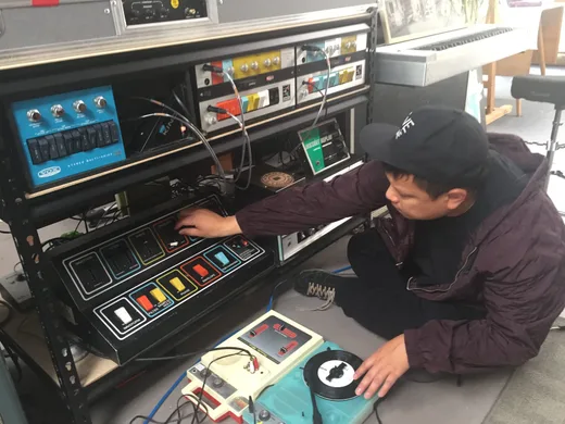 I tried that one and it was a little too dark, but then I tried the Fairchild 658, and it was super noisy, but it worked. Like a garage band from the '50s. Some of the drums and some of the vocals would go through that. By that, I mean from turntables. I recorded the drums pretty dry. I don't have a big reverby room, but I remember using an Altec 639 [microphone] to record the whole kit from afar to get that blendy sound. I put it through a Digitech Drop pedal and lowered it a couple semitones. It was in real time, almost like doing a low bitrate pitch shift down. I gave it this boomy, sampled sound to begin with. I cut that to vinyl and then juggled it back and forth through the vinyl. Sometimes I would record the turntables direct, but often I would put them in another room. There's a little bathroom near my studio, and I had a Fender PA tower in there. It's a small bathroom, but it reverbed all over the place. I probably wasn't doing it correctly, but it was getting some sort of vibe. I threw it in there with the [Shure SM]57 and caught it scratching in it live.