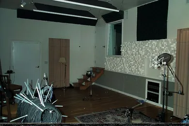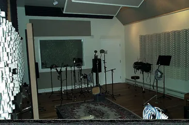 I was going to build one big room in there and I talked to an acoustics guy and he gave me the absolute longest length given my width and height that I could work in for the least amount of standing waves. I went with his acoustics idea. I found out that if you're not building a really multi-sided room, to stay with a pretty strict rectangular shape. The reason being is, and I didn't know this, that if you create a very limited frequency standing wave, that it's a lot easier to handle and deal with then if you tilt a wall slightly and create a band of standing waves in a certain frequency area. So let's say you've got a standing wave that's sitting at 100 Hz and then you cock your long wall a couple of degrees then all of a sudden you have a multitude of standing waves from 90-110 Hz. So I did that and I talked to RPG and their idea was absorption on the walls and diffusion on the ceiling, which I wasn't into. It seemed like I would waste my time doing a large room and then kill the reflections on the walls because we don't hear things that way. I'm not killing them because I did the opposite thing-some hanging panels on the ceiling to break up the ceiling-to-floor reflections and diffusion on both of the long walls. You've heard it — it's a very live room. You can hear it on [Clutch's] "Jam Room" really.