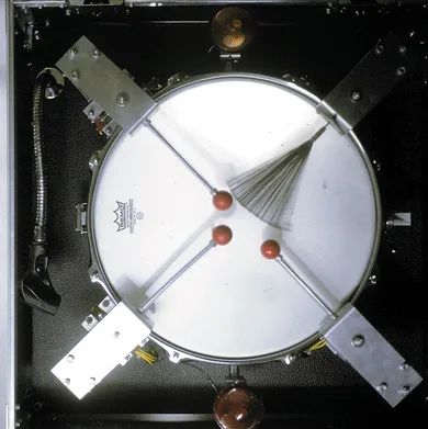 I'm very interested in doing light modulation into the computer and MAX would be the perfect thing to use 'cause then I wouldn't have to have all these cheap samplers packed into little boxes. I could just make interfaces, which would be much more fun and wouldn't weigh as much. [laughs] I'm working on a new instrument, which is a more portable version of the robotic drum kit. It's going to be an electroacoustic drum system that utilizes electromagnetic sounds, piezo-sensitive sounds, and acoustic sounds, and it will also have MIDI- ized acoustic filters in it. That will hopefully be done for our new record. What I've been doing is inventing a new rhythm section for each record.