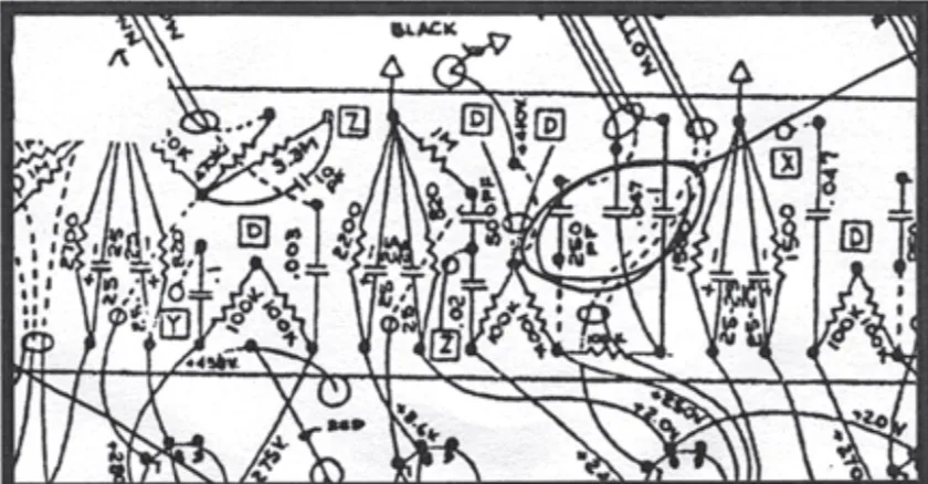 Which is really valuable when you're not that versed in reading schematics. The thing about this book is that it's really poorly written, actually all three of the books are really poorly written. There's a lot of really great stuff that you have to dig for. Little tricks you can do. For example, you can buy a resistor at Radio Shack and solder it to a couple of RCA plugs and plug it into the reverb in and out and use the reverb foot pedal and you have an extra gain stage. It actually sounds really good. That's what I used in Karate for a couple of years. There's another book by this guy Aspen Pittman, who runs Groove Tubes, and it's called The Tube Amp Book and it's volume 4.1 by now. That one's cool 'cause its got a lot of pictures of all these old amps and stuff and it's really and has reproductions of all these old Fender ads and everything. But it's also a huge ad for Groove Tubes which is kinda annoying. My personal opinion is that they're more of a marketing company. I can't tell the difference between them [Groove Tubes] and Sovteks, which cost half as much. The great thing about that book is that it has this little part of it in the back that has this step-by-step way to troubleshoot an amp. Where to start looking for problems. It's a way to service tube radios; this system you can use to troubleshoot amplifiers, and I've never seen that printed anywhere else. It's really valuable just for that. The other one is a book called Dave Funk's Tube Amp Workbook. This guy Dave Funk is really a total goofball. He's a genius, a real electrical engineer, and he's worked designing lab equipment and everything that you can imagine. But he's a terrible writer. The book's terribly written. I have a Masters in English and I edited journals and everything like that but I don't think I could have read these books without having that knowledge. There's a lot of stuff in there that's really valuable. To really get a sense of what I was doing, just being completely ignorant, I had to read all three of them a lot. The Kendrick book in particular is really great, down-to-earth and the most accessible of all of them.