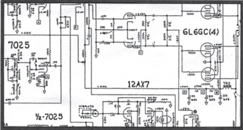 This is all stuff that other people have done that I found out about. For example, a lot of Fender amps have two 68K ohm resistors that come off the two inputs. You can simply remove them. The reason that they're there is so you can use both of the inputs at once, which people used to do so you could put a guitar and a microphone in and you could sing and play guitar, which of course nobody does. So you can remove those and it sounds better without them 'cause they bleed off certain frequencies. There's other things you can do. On a two channel Fender amp, pull out the first preamp tube which runs the first channel. What that does is it makes the second preamp tube run a little hotter. The first channel doesn't work anymore but nobody uses the first channel. If you don't use the vibrato on a Fender Twin you can disconnect it. The way that a vibrato works on most of the later Fenders is that, even if you have it off, it always bleeds off some of the signal to the ground so you lose fidelity. There's a brown wire that's connected to the vibrato jack for the footswitch, and you can disconnect it and it disconnects the whole vibrato section of the amp. There's something called a negative feedback loop on a lot of amplifiers and that is where the signal goes through the amplifier and then it goes through the output transformer and then to the speaker jack. There's a wire that goes from the speaker jack back to another part of the amplifier, like one of the preamp stages. It sends part of the signal back to the preamp stage and the effect that it has, and I don't really understand exactly why, but it cancels out a lot of the odd order harmonics and enhances the even order harmonics and I think it might have something to do with the phase that it's in but I don't quite understand it. But the effect of simply disconnecting that wire is that you get a real sorta browner, crunchier sound out of the amplifier. Actually, a presence control on an amplifier isn't a tone control. Tone controls are passive circuits. There are different capacitors and resistors that bleed off certain signals depending on how much signal you put through them. But a presence control is actually a potentiometer (a variable resistor) on the negative feedback loop. So it's active and that's why that control makes noise. It actually has voltage on it from the negative feedback loop and controls how much of that goes back into the amplifier so you get that sizzling sound when it's really high.