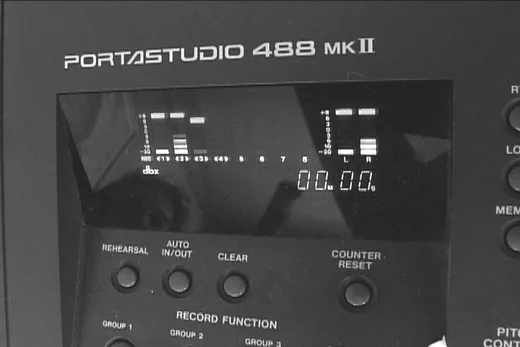 By now we've filled up all 8 tracks — drums on tracks 1-3, guitars on tracks 4 & 5, synths on tracks 6 & 7, and bass on track 8. It is at this point that I do my first mix. I mix the entire instrumental, in stereo, onto my DAT machine. I use my home stereo system for monitors. After I'm happy with the mix (I always make more than one mix) I record it back onto a fresh tape on the 8-track. I record it on 4 tracks in stereo (4 instead of 2 tracks to keep the sound as fat as possible). This leaves me with 4 new tracks which I use for vocals. I like this method instead of ping-ponging, because it leaves me with the option of one day going back and remixing the basic instrumental track.