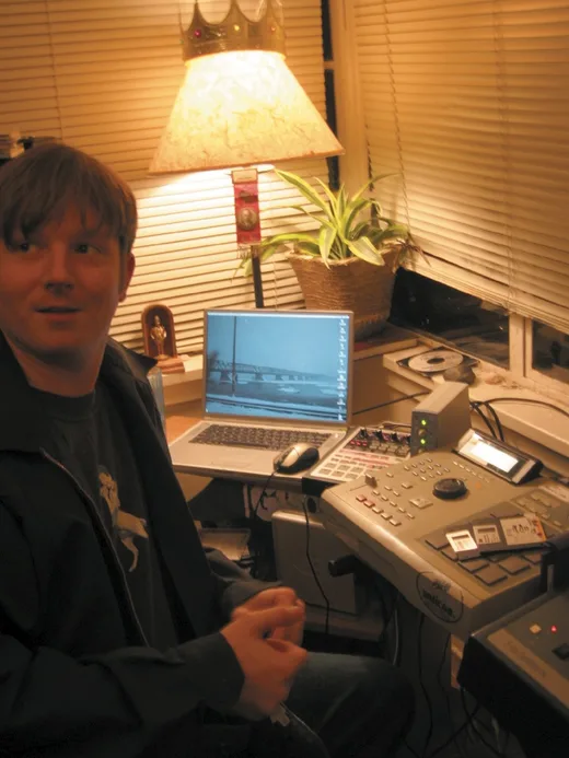 Doseone is surrounded by well- worn equipment.>>> "Powerbook G4, Pro Tools 6.0 and Mbox, which is used for sequencing, re-sampling, mixing, ruining, everything. Jel took my MPC and Yoni [Why?] had all my keyboards, so I had nothing but this [G4] for a year so I learned to use it. We all bought computers within the last year and none of us are on the same platform. A Technics table that I pretend to sample off of but usually I just play keyboards into my trusty MPC 2000 XL, which Jel has worn. Look at this — it's disgusting: finger grease all over my MPC. A Joe Meek VC3Q compressor, AKG 414, Korg Poly-61 that Why? stole, Casio CZ-101, three megaphones. I have a slew of shitty microphones, probably twenty. I have my handy-dandy Sony Dictaphone that I've used for eight years without breaking, an E-Mu Systems Drumulator and I pretend I'm Jel when he was seventeen with it, then I have the workhorse that predates my G4 and that's the Roland VS-880. I did almost every record up to a point on that. Started Themselves' No Music. Did the Them record, did Hemispheres, did cLOUDDEAD, and a lot of remixes. Line 6 DL-4: I would use that live for all the vocals and I would loop everything and it was fabulous for that but it's hyper-noisy and the soundmen are not cooperative when you're running your own vocals on stage. They hate that and this doesn't help because this thing's so sensitive. So it's half pain in the ass, half really great toy. I discontinued it and now I use the Kaos Pad. I have the Behringer that I discontinued because it was too noisy. They're cheap if you don't have the money. They last as long as they cost: 200 days. I have a collection of reel-to-reel Dictaphones, regular Dictaphones, a mini disc recorder, the Korg digital 4-track, the Pandora thing, which I really love. All the field recordings on the cLOUDDEAD record, and pretty much everything I've done for the past three years have come off that. Seventeen shitty swap meet keyboards, no one a duplicate. It's a vast collection of unusable, AA powered trinkets. I sample off the TV, VCR, video games. I have Nintendo, Sega, Colecovision, Atari..."