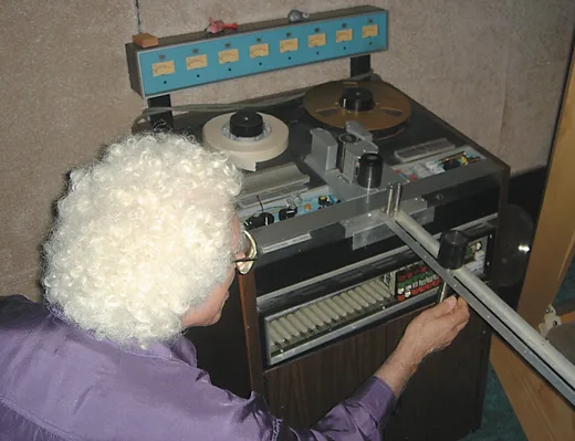 No idea what happened to it. It was probably used as scrap. It wasn't an intentional session, and there was no log of it or anything. What I found out was that there were no engineers with musical training, and no musicians who knew the technical side. I took advantage of being principal bassist at the BBC to hang around with the engineers and learn what they were going. They don't call it engineer over there — they call it studio manager. An engineer in the BBC is a guy who sits behind a glass wall, he does the alignments of the machines and he does the switching. He's the engineer. The guy who pushes the faders up and down, he's the studio manager. The theory is you can't be a producer until you've been a studio manager for four years. If you don't know the job, you can't tell somebody else how to do it. However, when I got sick with my lung trouble [which prevented him from playing bass regularly] they dug up this regulation that said that my service experience counted as part of that time. All I needed was a six- week familiarization course. They taught me tape editing on these big machines. Where the left hand reel would be, you had a big drum with six feed reels on it, and you had a clutch pedal that would disengage the reel motor, and then you had two out reels and a basket for garbage. So your main program was being assembled here off of six possible sources, and you end up with two reels, your main reel and your outtake reel. I'd love to have one of those machines these days! I also went over to the Radiophonics Workshop, where I saw a splicing block three feet long, with an angle — that's how they used to do crossfades. They'd take a tone and another tone, and put it on this splicing block, one razor blade down the middle, and it would fade from one to the other.