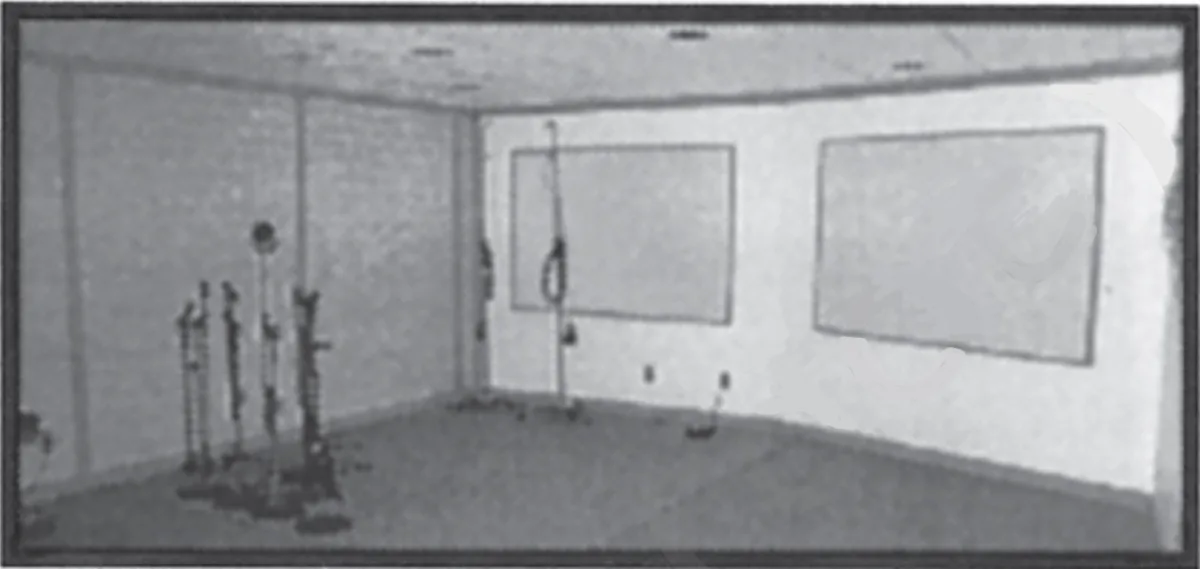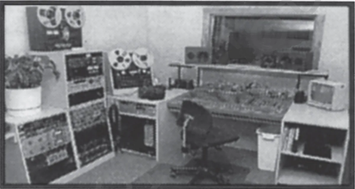 The tracking room and the recording room were separated by a space occupied by a desk, an upright piano and a sofa. The tracking room, with the door closed, was completely isolated from where I ran the session, so couldn't see what went on inside. In order to have visual contact with the band, I bought a closed-circuit TV system for $300 from Costco, installed a fish-eye lens, mounted the camera in a corner of the tracking room, and voila!--I could see the band, but they couldn't see me. No 'band in a fishbowl' vibe. Clients liked being in the tracking room with no-one looking in at them. I was in business at $17 per hour. My first customer was a veterinarian's receptionist who sang along with a Karaoke tape. The thrill of operating a studio was finally mine.