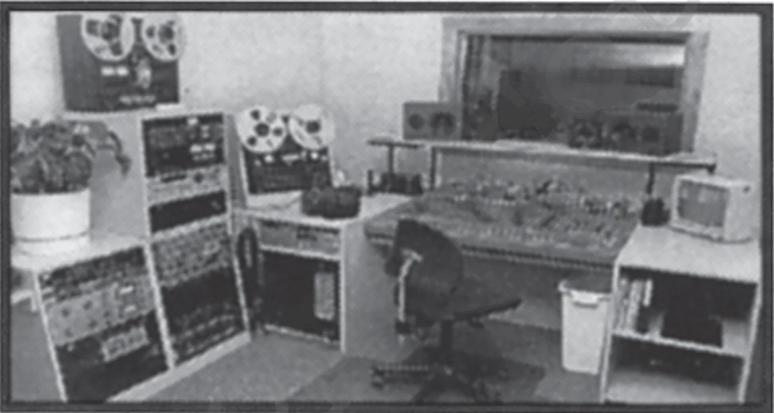 From the first day I spent in the new location, I suspected that long daily periods of time in a windowless basement would drive anyone nuts, especially in a space painted a hideous dogshit brown. I wanted the interior to be light but neutral colored, so I painted everything I could off-white and bought many yards of cream-colored sofa fabric cheap from a fabric store that specialized in odd lot industrial fabric overruns. We covered the fibreboard panels on the tracking room walls with sofa fabric, then edged the panels with 1x4' fir trim, painted grey.