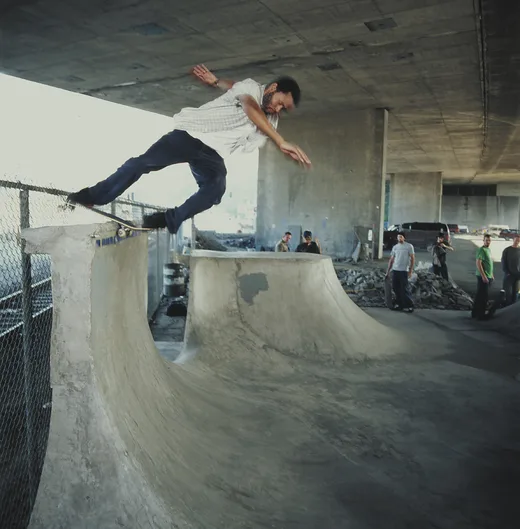 "The other thing for me personally, is that I always loved music. When I was young AC/DC and Angus Young were my heroes. Every other week, my parents would take me and my brother and sister to Rainbow Records in San Jose where we lived then, and we could get one tape. I'd always get an AC/DC tape. I had every AC/DC tape out and one of those was a live album, so I remember playing that in my little boom box pretending I was Angus. But the thing is, until I got into skateboarding, I didn't know anybody that had a guitar. Once I got into skateboarding, the friends I made, they all played in punk bands, so all of a sudden musical instruments were accessible. I'd hang out at band practices and when they were taking a smoke break, I'd pick up the guitar and get them to show me chords. It made it accessible, and I'm beginning to realize that's the key to anything. You can sit around and wanna' do something, but unless you're able to actually get to it... So it made it accessible and it turned me onto so much new music. When we were skating ramps, you had the boombox going with Minor Threat, Bad Brains, The Faction [Steve Caballero's band, another Bones Brigade member], Social D, Vandals — and then we started getting into Metallica and Slayer, and then my buddies started learning to play those songs. Then skateboard videos turned me onto bands like Dinosaur Jr. and fIREHOSE. I love how the two are so intertwined, because it's part of the experience and the culture."