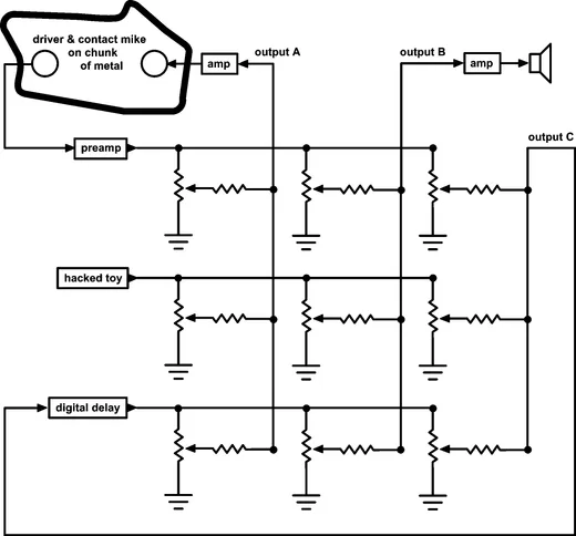 Empowering as it is, "circuit bending", as inspired by the wonderful Reed Ghazala, has its peculiar orthodoxies. Looking at my instruments as I was setting up a demonstration at the Bent Festival at The Tank Gallery in NYC in 2004, an audience member inquired, "are they bent or hacked?" When I looked baffled he elaborated: "'Bent' means you have no idea what you are doing when you open up the circuit; 'hacked' means you have some idea." I don't care about those kinds of distinctions. I just try to find the best tool for the job, bought or made, acoustic or electronic, analog or digital, software or hardware, hacked or bent. In general, because I'm not an engineer, or a great programmer or wealthy, I look for the simplest, cheapest solution; but because the solution has to serve "art" rather than commerce, I also want a solution that is rich. I've never had to build "a fuzz box", so if I need to distort something I might or might not end up with a fuzz box. Throughout my workshops and the book, for example, I emphasize the importance of doing things "wrong", backwards, of trying anything at least once. I chose designs and components that were cheap, easy to get running, capable of operating over with a wide range of component substitutions and unlikely to burn out no matter how you hook them up. This led to some very non-standard devices and designs — there are no "op- amps" or transistors anywhere in the book, for example. I guess unconventional has been conventional in my own work for so long that I don't even think about it anymore.