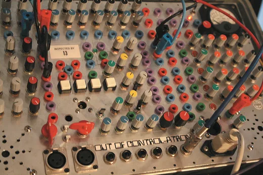 Well, I worked with a circuit designer, Tom Doty over at Paramount Recording. I came up with the name first, "The OutofControl-atron." Once I came up with the name, I said, "I'm gonna build this thing." Then I thought to myself, "I'll never build this thing..." The beginning happened at a Cypress Hill session — they showed up about six hours late. While waiting I drew up the initial plan. After I sketched out the OutofControl-atron, all the modules and the layout for it, I talked to Tom Doty about the electrical design. He's really into modular synthesizers and really knows circuit design. He gave me a book on circuit designs. I read the book, and then read a couple of other electronics books just to get a taste for it... but I'm still not that great at it. I laid out the front panel in TurboCAD, then hand drilled it. It took a hundred hours just to design and drill the whole front panel.