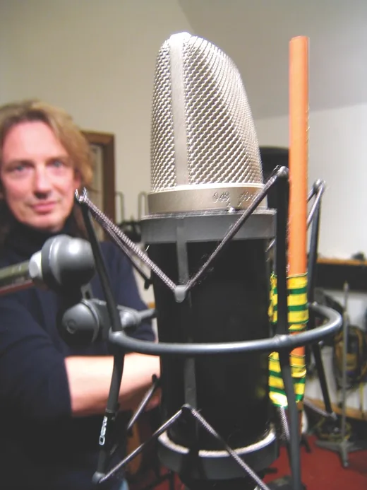 The MD2. I've got an early Groove Tube MD2 [condenser mic], which is my favorite for vocals. It's a bit noisy. It hums. I've got to cut off everything below 45 Hz to get rid of that. I don't care. It sounds great. I use a pop shield. Sometimes I use a pencil, which is cool.