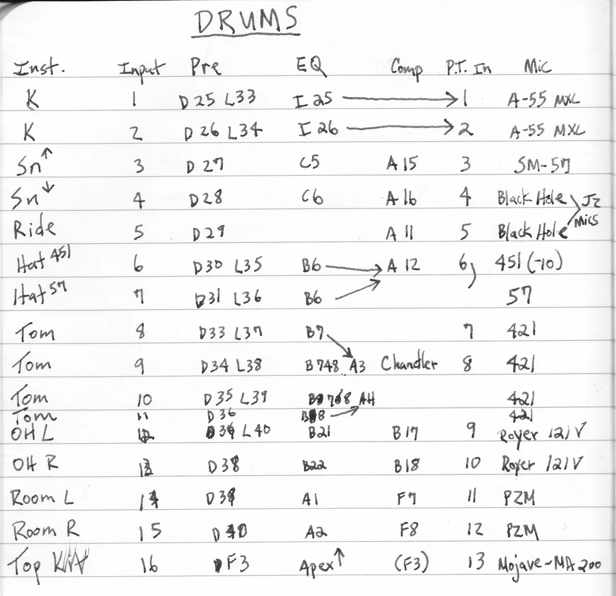 Oh man, it's brutal for every session, but it's so much fun and so enjoyable! The tracking is one thing and then the mixing is a completely different animal. I have to be completely on my game because for mixing, documentation is so key and so crucial because there's so much outboard gear that we use. We've got so many different types of compressors, EQs and effects processors. Everything's got to be precisely documented. I mean down to the fractions of the Summit Audio... When the song is over, after we printed back to 2-track tape, back to the one-inch, and after Joey's reviewed and likes the way it sounds, then it's my job to write everything down exactly the way it is.