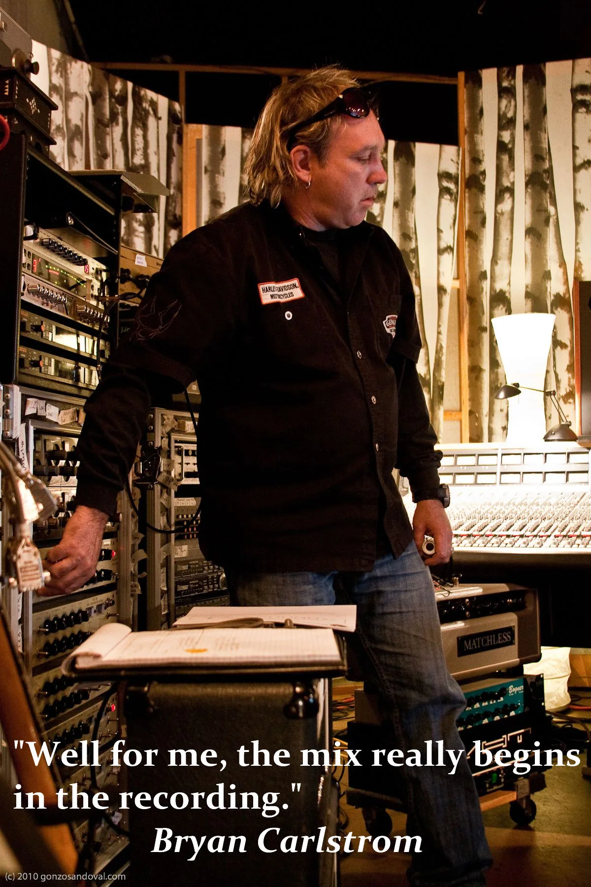 When I asked Bryan Carlstrom about how he approaches the mixing process and whether or not he had a general system he followed he responded by saying, "The mixing really starts with the recording. When I'm recording a record I'm recording it in a way that I know it'll mix well... what I need guitar-wise, what I need bass-wise, the drum production, any samples that I'm going to be using and the ambiance that I'm recording around the drums. So when I get done with a project the songs are mixable." Carlstrom notes that he always has the mix in his mind consciously or subconsciously as he goes through the recording process so that when he is finally at the mixing stage things fall into place easily. "As I'm recording a project I'm trying to work on the balances and EQs of things along the way, because in the SSL [Solid State Logic 4000 E/G] I can store setups. I'm gradually figuring out the EQs that work across things so that when I do get to the actual mixing of the record each song is already set up [and] across the board things are coming up where they're supposed to be for mixing, as well as the general EQs. There's going to be some tweaking, but most of that is going to be setup and somewhat dialed ahead of time. When I start mixing, it's really going to be just working the overall foundation of the mix — making it solid, balances, and then adding any effects or production that I'm going to be adding in."